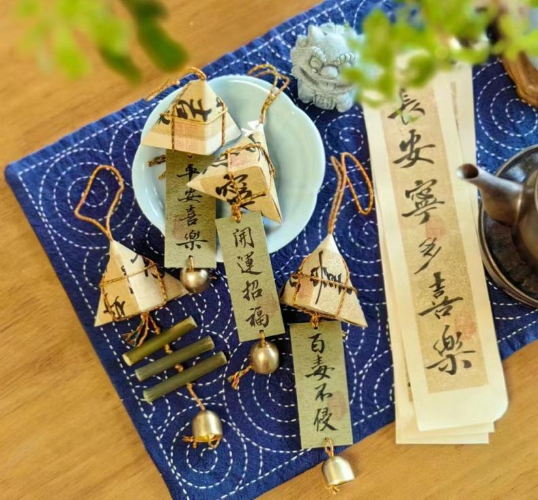 This photo shows Zongzi-shaped ornaments with hand-written calligraphy on them. (Photo by Cai Cai/Handout via Xinhuanet) By Liu He