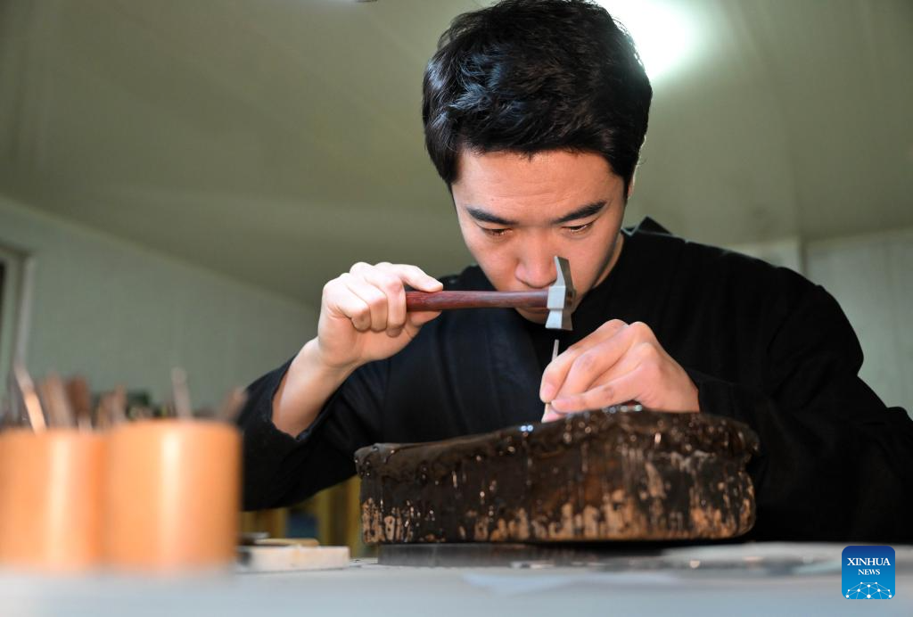 Ma Sai makes a filigree mosaic artwork at his studio in Liuzhuang Village of Wuqing District of Tianjin, north China, March 19, 2024. (Xinhua/Zhao Zishuo)