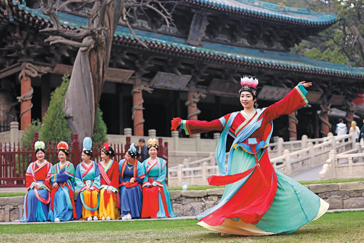 A dancer in traditional costume performs at the Jinci Temple Museum in Taiyuan, the capital of Shanxi province, in March. (ZHU XINGXIN/CHINA DAILY)