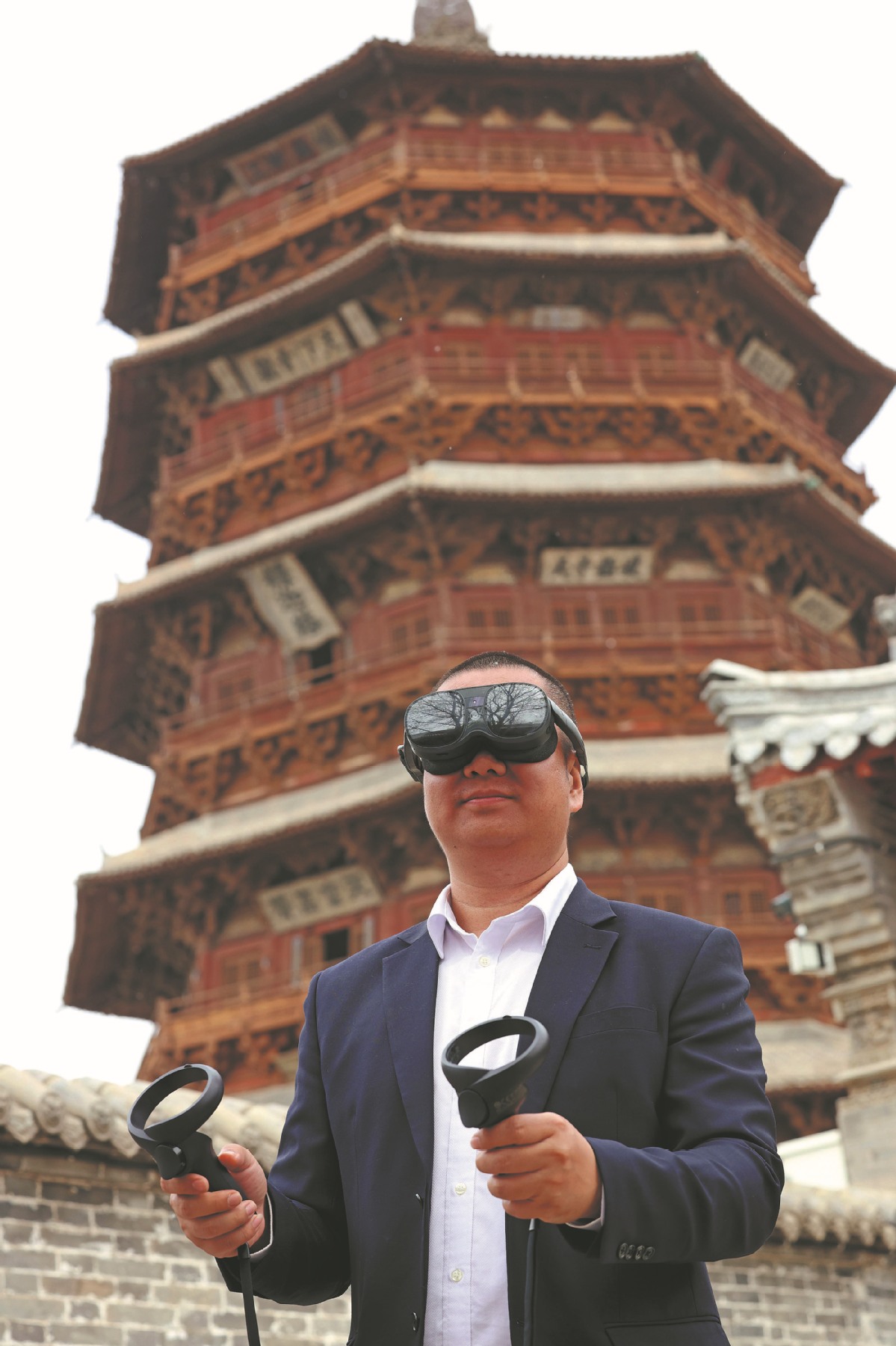 A worker experiences "climbing" the Sakyamuni Pagoda with virtual reality gear in Yingxian, Shanxi province, in April. (ZHU XINGXIN/CHINA DAILY)
