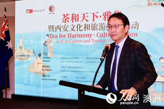 Xiao Xiayong, minister-counsellor of the Chinese Embassy in Australia, speaks at the opening ceremony of Tea for Harmony · Cultural Salon & Xi'an Culture and Tourism Promotion activity in Sydney, July 27, 2024. (Photo/Yuchen Bai)