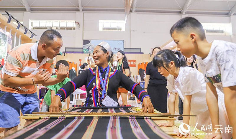 A villager from Banmu village, Ximeng Wa Autonomous County, Pu’er city, displays the technique of Wa brocade weaving, during the 8th China-South Asia Exposition and the 28th China Kunming Import and Export Fair in Kunming, southwest China’s Yunnan Province. (People’s Daily Online/Hu Zunhui)