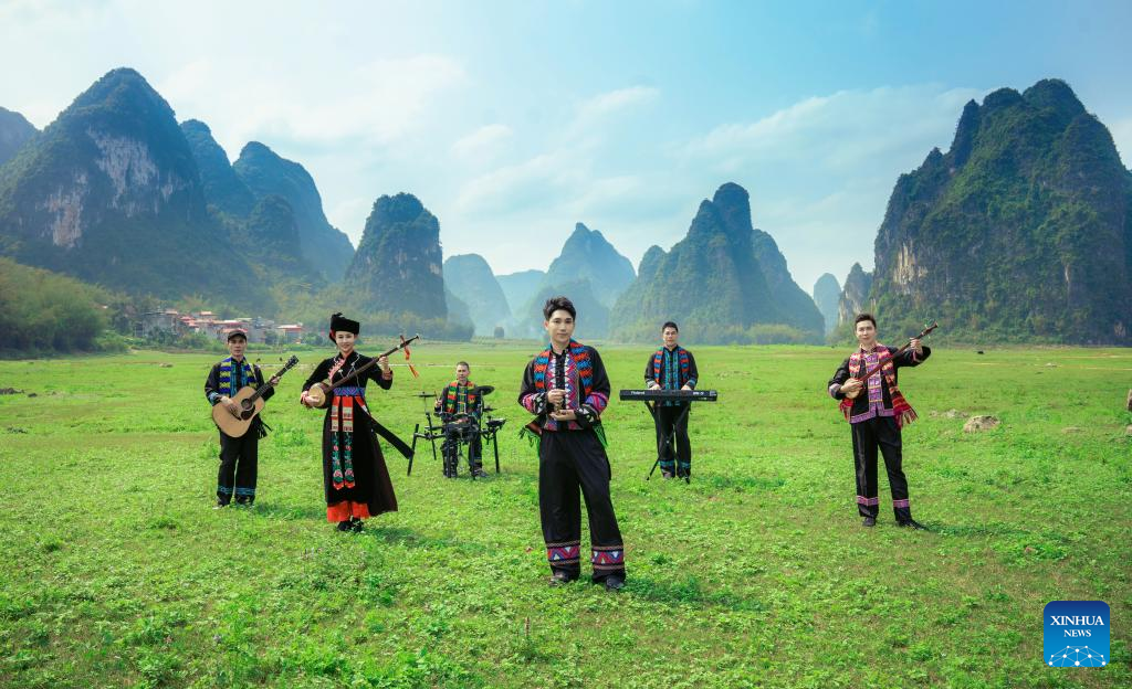 In a scenic spot nestled among the verdant karst hills of south China's Guangxi Zhuang Autonomous Region, a band of five men and a woman are putting on a pop concert, dressed in embroidered ethnic costumes.