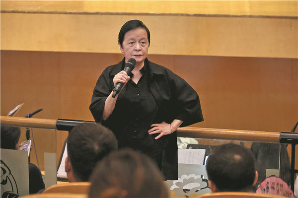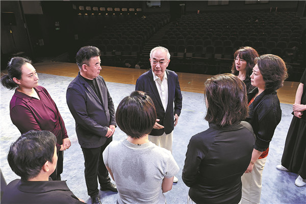 Veteran Peking Opera artist Ye Shaolan (center) discusses moves of the Peking Opera piece, The Legend of the White Snake, with the creative team members of the new edition of the classic piece, at the NCPA, on Aug 27.[Photo provided to China Daily]