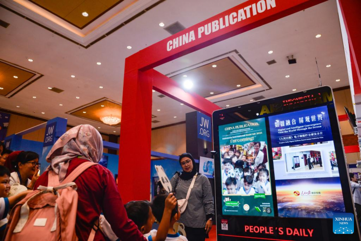 People visit the booth of China Publication during the 2024 Indonesia International Book Fair at Jakarta Convention Center in Jakarta, Indonesia, Sept. 25, 2024. (Xinhua/Xu Qin)