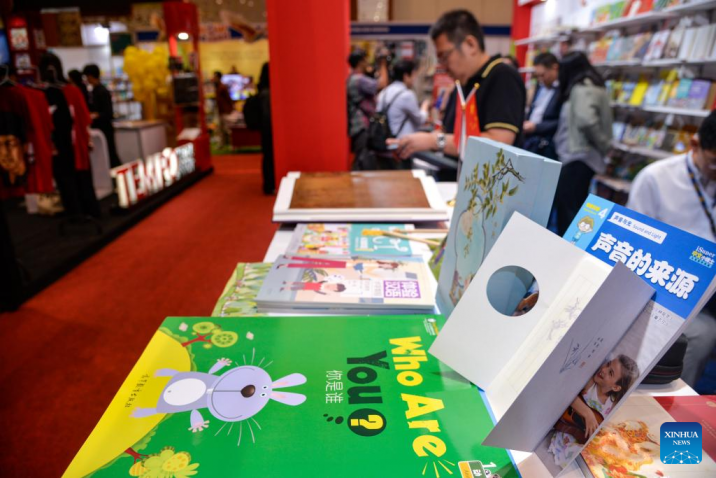 Books are on display at the booth of China Publication during the 2024 Indonesia International Book Fair at Jakarta Convention Center in Jakarta, Indonesia, Sept. 25, 2024. (Xinhua/Xu Qin)
