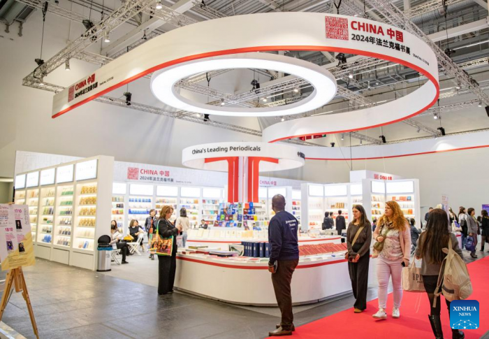 Visitors are pictured at the Chinese publishers' exhibition area at the 76th Frankfurt Book Fair in Frankfurt, Germany, Oct. 17, 2024. The Frankfurt Book Fair officially opened on Tuesday. Chinese publishers are making a significant impact at this year's fair, showcasing more than 3,500 books, including 1,500 in foreign languages. In addition to new book releases, Chinese publishers are holding numerous premieres and signing ceremonies for copyright agreements, with up to 1,000 books available for copyright trade. The fair will also feature a promotional event for the 2025 Beijing International Book Fair and a session on copyright trade between China and Europe. (Xinhua/Zhang Fan)