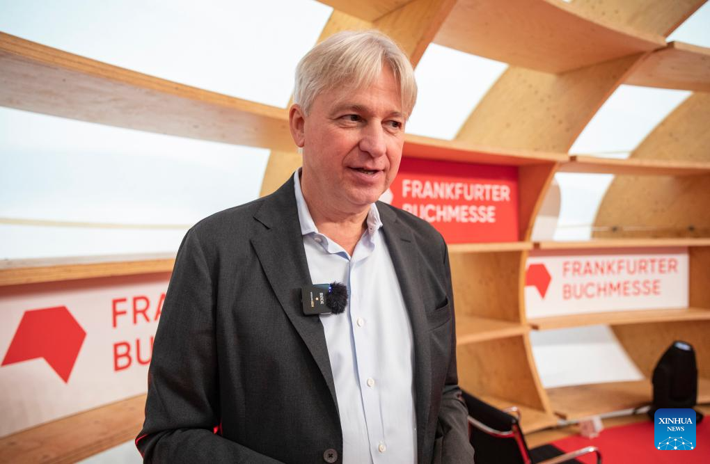 Director of the Frankfurt Book Fair Juergen Boos speaks during an interview at the opening ceremony of the 76th Frankfurt Book Fair in Frankfurt, Germany, Oct. 15, 2024. The Frankfurt Book Fair officially opened on Tuesday. Chinese publishers are making a significant impact at this year's fair, showcasing more than 3,500 books, including 1,500 in foreign languages. In addition to new book releases, Chinese publishers are holding numerous premieres and signing ceremonies for copyright agreements, with up to 1,000 books available for copyright trade. The fair will also feature a promotional event for the 2025 Beijing International Book Fair and a session on copyright trade between China and Europe. (Xinhua/Zhang Fan)