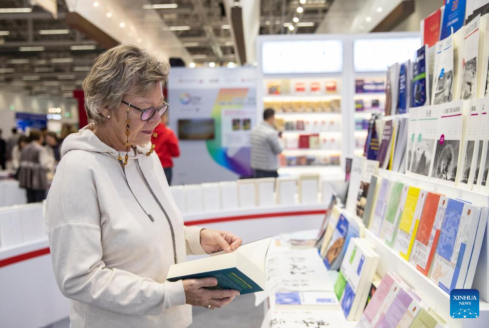 A visitor looks over a book at the Chinese publishers' exhibition area at the 76th Frankfurt Book Fair in Frankfurt, Germany, Oct. 17, 2024. The Frankfurt Book Fair officially opened on Tuesday. Chinese publishers are making a significant impact at this year's fair, showcasing more than 3,500 books, including 1,500 in foreign languages. In addition to new book releases, Chinese publishers are holding numerous premieres and signing ceremonies for copyright agreements, with up to 1,000 books available for copyright trade. The fair will also feature a promotional event for the 2025 Beijing International Book Fair and a session on copyright trade between China and Europe. (Xinhua/Zhang Fan)