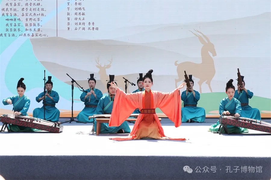 在活動啟動儀式上,簫韶樂團帶來了《詩經·小雅·鹿鳴》《詩經·小雅·由儀》等雅樂曲目,八音齊鳴,神人以和,仿佛《詩經》千年風雅之遺響;在佾舞展演環節,簫韶樂團展示了明代《闕里志》版祭孔佾舞,管弦翟籥,合止柷敔,以文質彬彬之舞容崇宣孔子的魅力與功績。